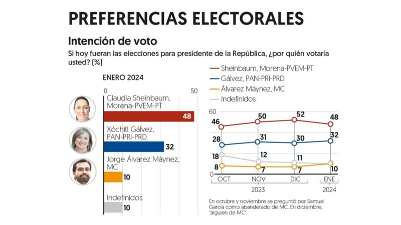 Comparados con la encuesta anterior, realizada en diciembre, la variación en el apoyo a Sheinbaum es de 4 puntos menos, el de Xóchitl 2 puntos más y el de MC mejoró 3 puntos, luego del nombramiento de su candidato presidencial. Los indefinidos tuvieron una variación de un punto a la baja.